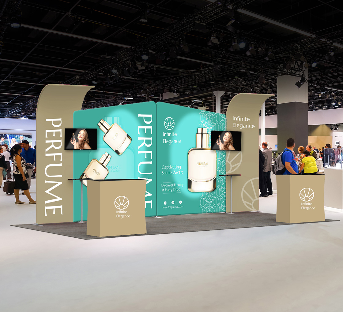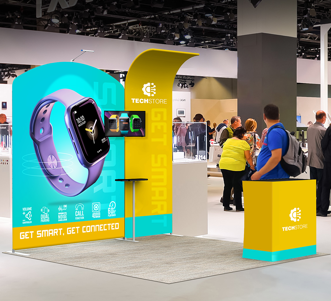 Opens in a new window.This all-in-one exhibit solution features vivid custom graphics, a modern modular backwall and interactive elements like monitor mounts, shelves and a podium counter.