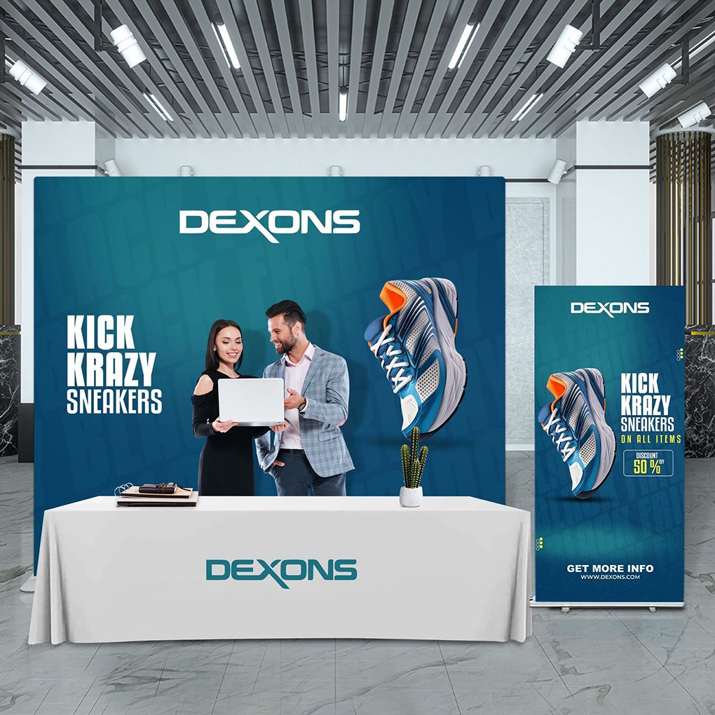 Set your clients up for branding success with this professionally printed package of event essentials that includes a table cover, backdrop and banner stand.