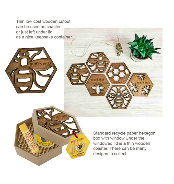 Concept: A hexagon-shaped box made from recycled paper. This versatile box serves as a nice keepsake container and its top can be easily popped out to transform into a bamboo coaster.